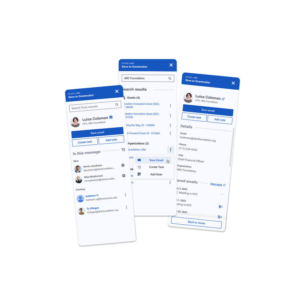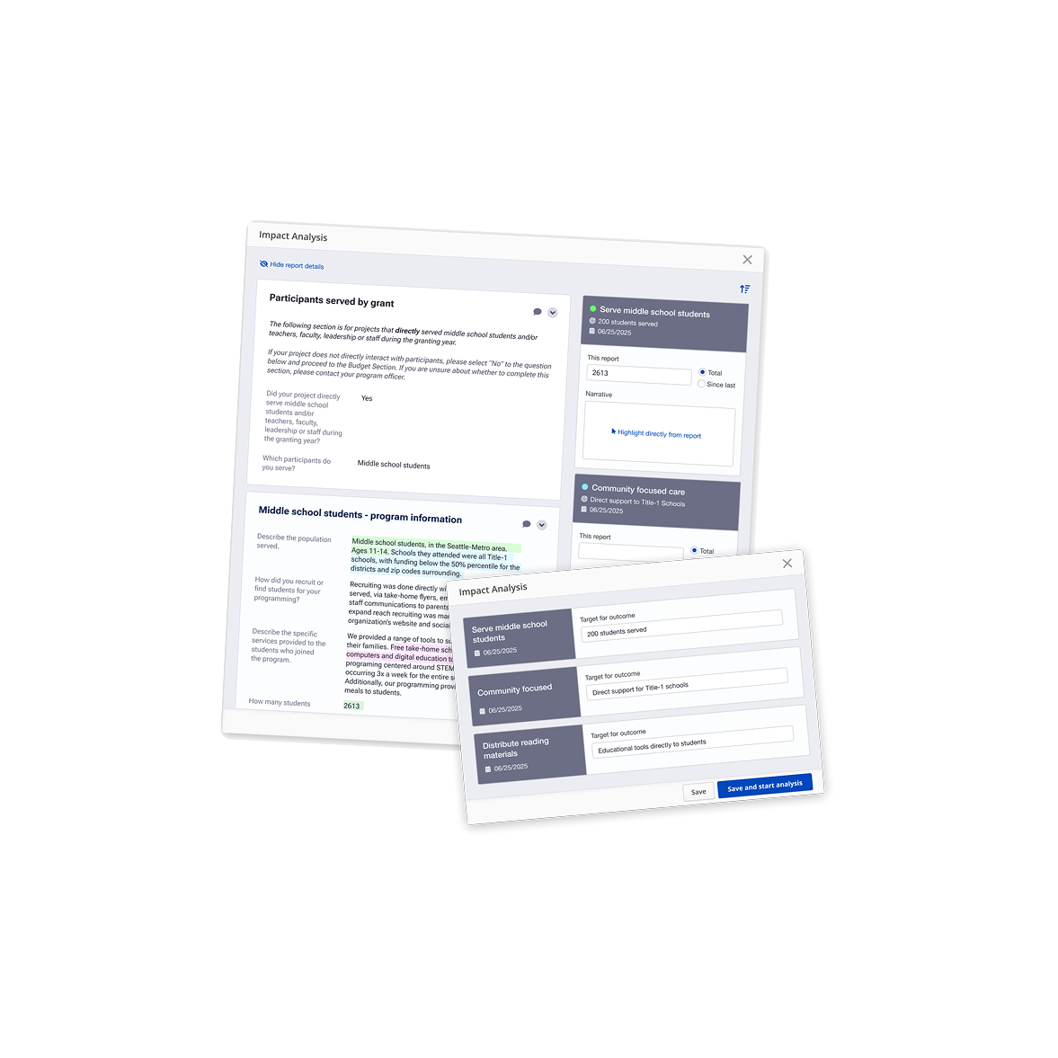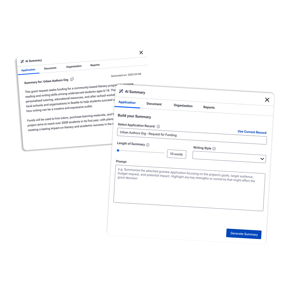 Grant Accounting Suite AI Summary Tool Data Visualizations Gmail Integration Fluxx Design System Impact Analysis Staff Evaluation Dashboard