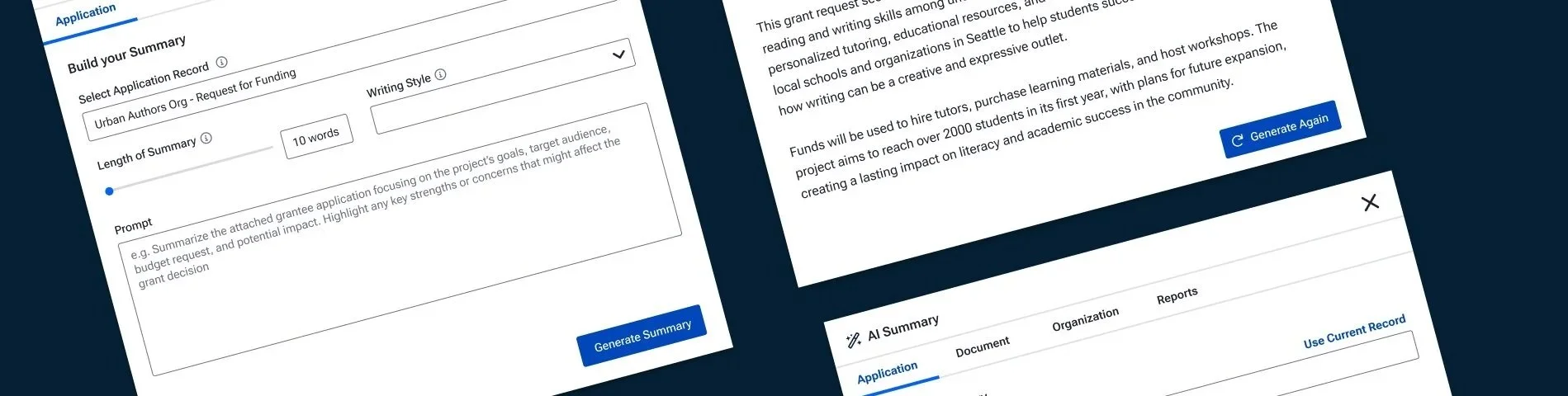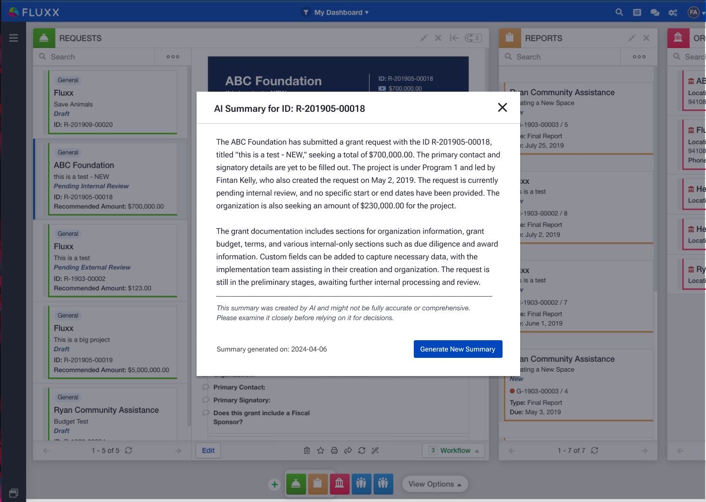 Following the successful launch of our initial AI features, I was tasked with designing a unified component to house AI summaries across the Fluxx dashboard, bringing together user data from documents, applications, organizations, and more.
