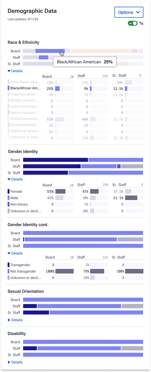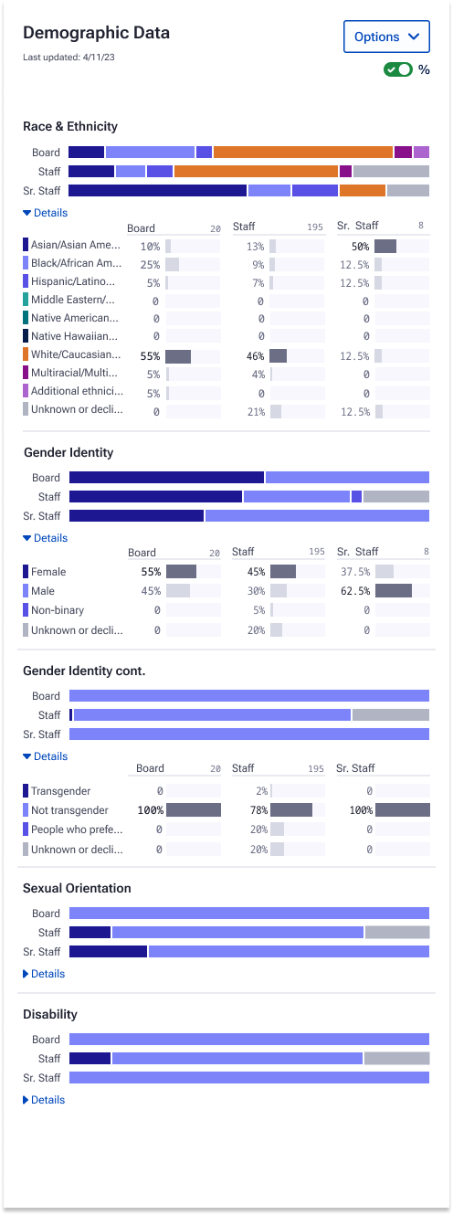 After research, I partnered with engineering to break down Candid’s Demographics API—focusing on what data could be surfaced directly in Fluxx. The API delivered standardized nonprofit demographic data on leadership, staff, and boards, including race/ethnicity, gender identity, sexual orientation, disability status, and data completeness percentages.