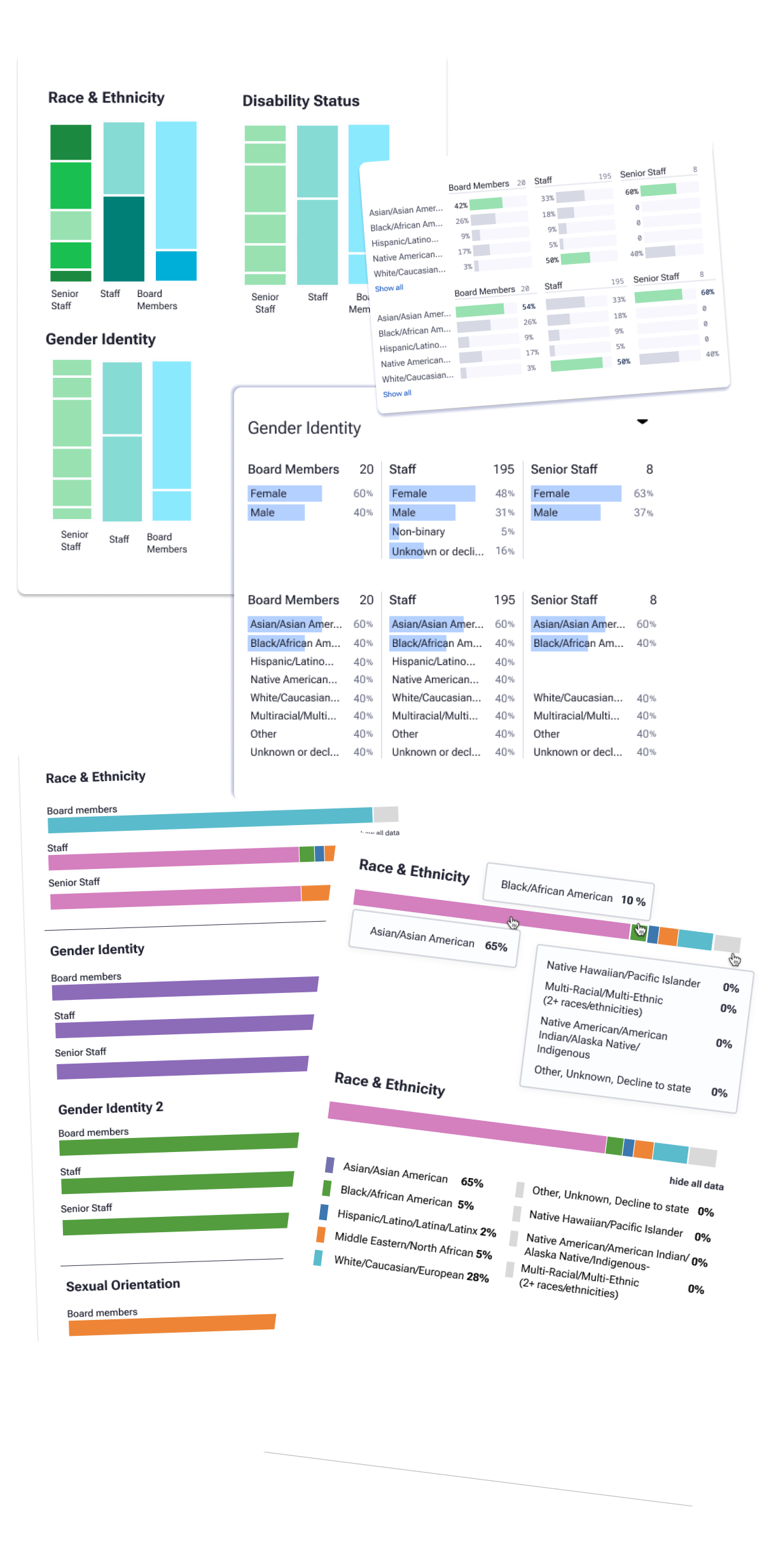 Technical constraints: The Candid Demographics API surfaced standardized but fixed data (e.g., race/ethnicity, gender, orientation, disability, and completeness scores), defining what could be visualized.