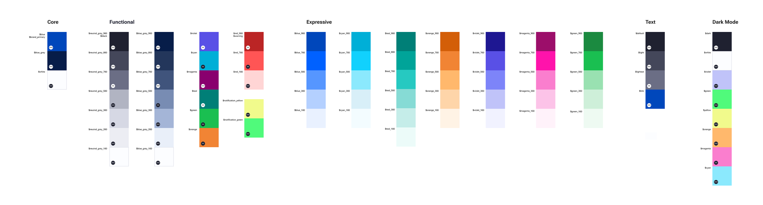 Sets of system colors that were separated into “functional” and “expressive”. Functional being tested for accessibility compliance and used widely across the system. While expressive was a pallete for our marketing team and any decorative elements within the site.