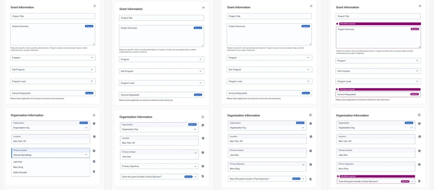 Focusing on areas that impact our users most, we built mock forms with our components. We started with forms because they are the primary tool used to review grant requests and proposals. It was an essential place to begin for the industry we serve. We then worked with our engineers to build and test a live form moving the process outside Figma and into code.